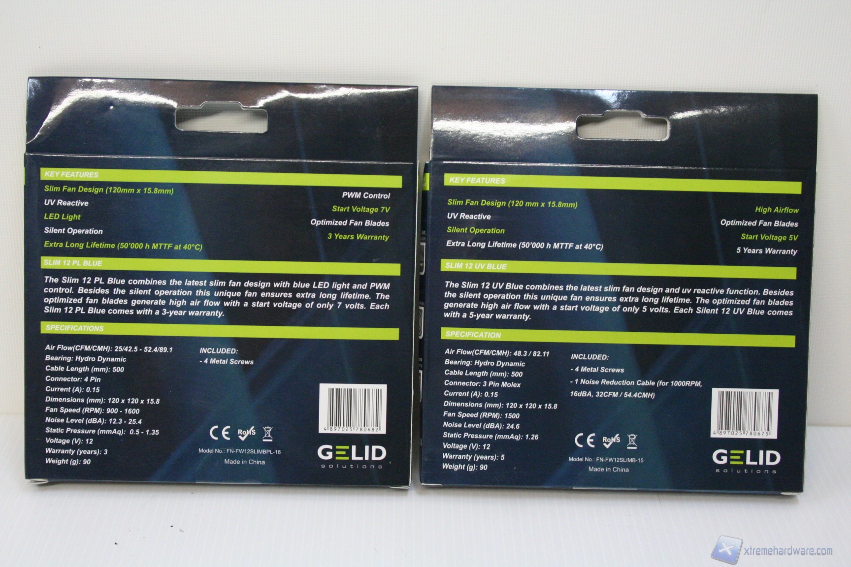Le ventole Gelid, tralasciando per un attimo il discorso UV e LED, sono di buona qualità complessiva e ci si rende conto immediatamente che Gelid, similmente a quanto fatto per i modelli recensiti da noi fino a questo momento, ci tiene molto all’estetica dei propri prodotti. Il flusso d’aria risulta elevato data la tipologia SLIM (Rimandiamo al capitolo dei test termici per la valutazione). La rumorosità al massimo degli RPM è contenuta per via della pressione statica, che però ci teniamo a precisare non è comparabile universalmente con le altre, per via di una serie di fattori nient’affatto secondari. Il target di utenza a cui si rivolgono queste ventole è certamente quello di utenti che apprezzano il silenzio, ma stringendo un occhio sia all’estetica che alle performance nel minore spazio possibile, e quindi in soluzioni dal Form-Factor contenuto. I dissipatori potenti richiedono generalmente ventole con elevata pressione statica ed elevati CFM e quindi queste ventole sono indirizzate principalmente a soluzioni intermedie, o meglio low profile. Il modello PL è PWM e regolabile, quindi non ci sarà nessun problema a livello di rumorosità perché basterà abbassare il regime di rotazione. Il modello UV invece è leggermente più rumoroso, ma comunque eventualmente regolabile tramite un fan controller. Riportiamo ora le caratteristiche tecniche dei due modelli in questione: